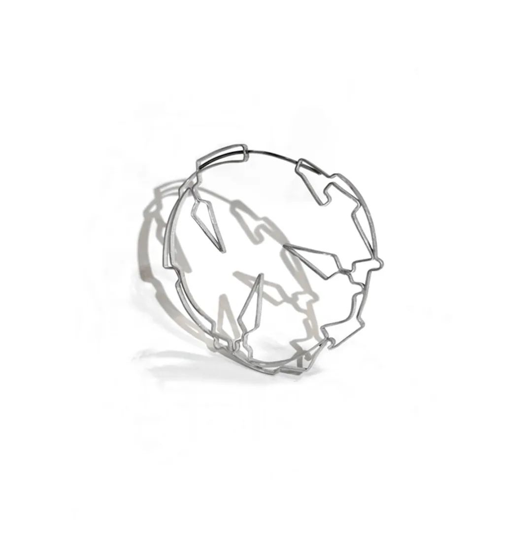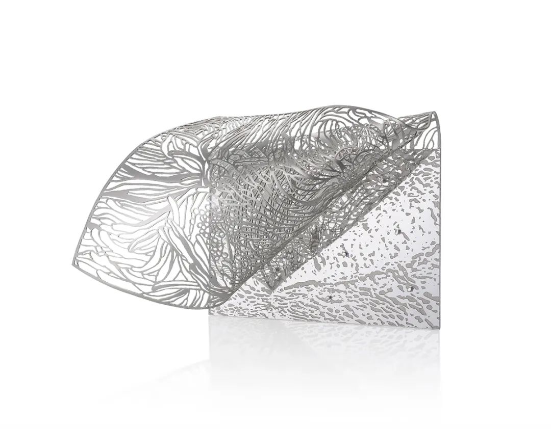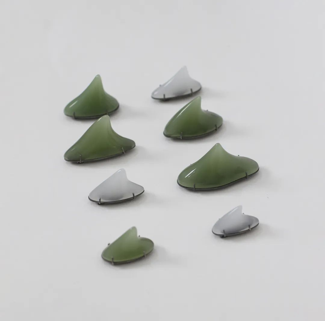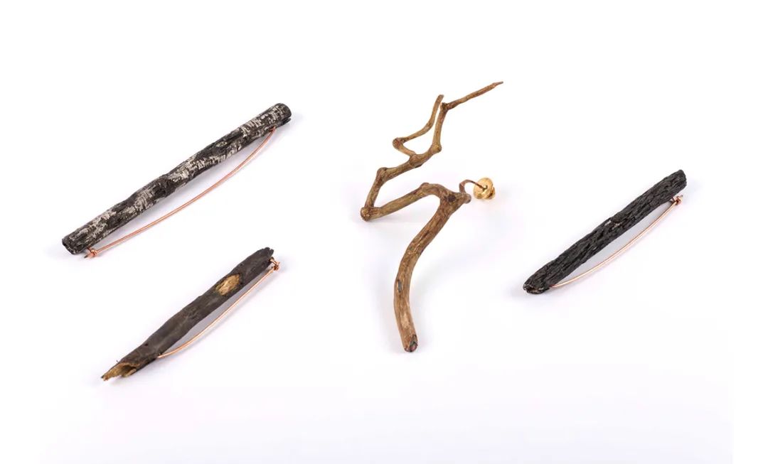 作為一位女性藝術(shù)家,小睦作品的氣質(zhì)雅致中透露著灑脫,自帶幾分風骨。她常借作品描繪“山水”,善用各色石材,因此她的首飾自然的具備了些許東方氣韻。扎實的金工令她可以在游刃間將金屬的可塑性極至展現(xiàn),然而創(chuàng)作時卻并不拘泥于依賴純手工制作。本次展出的20組首飾作品既貫穿為系列,又各自獨立存在。其中天然與人造材料依次出現(xiàn),同時包含多種材質(zhì)3D打印技術(shù),傳統(tǒng)與數(shù)字造物方式并用。多年來首飾設(shè)計經(jīng)驗的積累,使小睦能夠充分調(diào)動技術(shù)的可能性,使作品在松弛卻精準的狀態(tài)下產(chǎn)出。所謂“將任何技術(shù)都當作是手中的一把錘子”,在此得到豐富的詮釋。