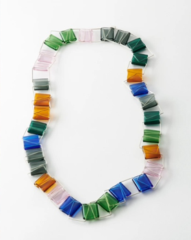 Marcus Scholz 在墨爾本街頭漫步時拍攝的一系列意外和故意的多重曝光膠片照片充滿了色彩和扭曲的建筑細節(jié)。這些獨特的照片讓 Blanche 走上了抽象和轉(zhuǎn)化的道路,這些獨特的照片被用作一套由彩色和透明硼硅酸鹽玻璃、陽極氧化鈦和銀組合制成的項鏈的起點。