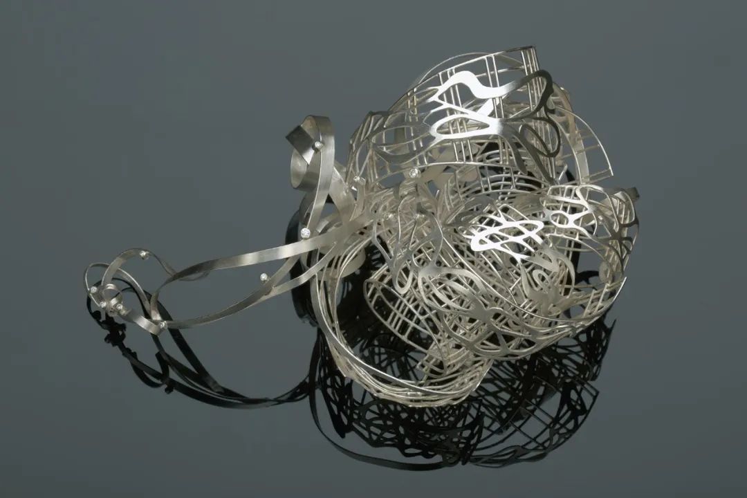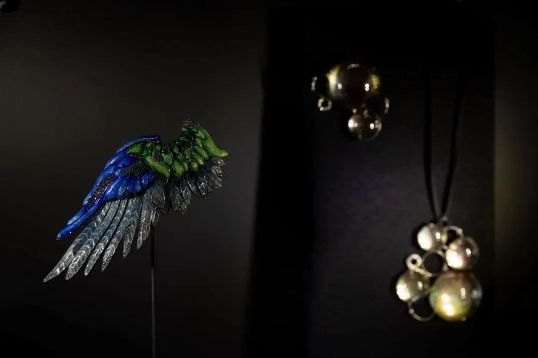 這個(gè)展覽完全取材于 RAM 不斷增長的收藏,在慶祝當(dāng)代珠寶的同時(shí)強(qiáng)調(diào)從新的角度(有時(shí)是字面意思)考慮它。例如,有些胸針的展示方式會(huì)將注意力集中在背面而不是正面。雖然佩戴一件衣服時(shí)背面可能是看不見的,但藝術(shù)家可能仍然會(huì)利用它是佩戴者與之互動(dòng)的一面這一事實(shí)——延續(xù)正面的元素,添加銘文,或者至少,深思熟慮地融入它進(jìn)入整體構(gòu)圖。