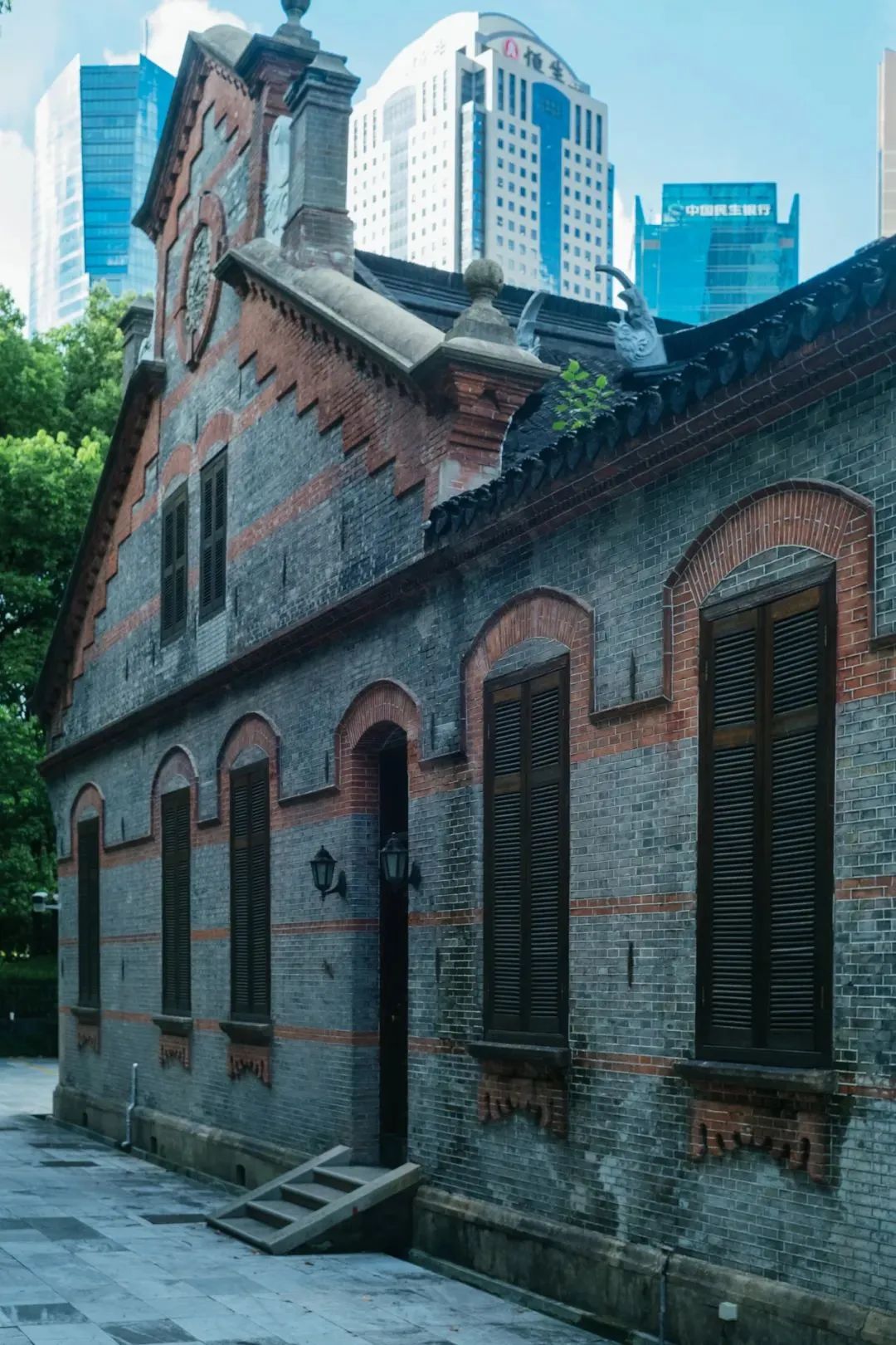 其次,建筑所在的陸家嘴地區(qū)也是一個(gè)“劇場(chǎng)”。與上海老城區(qū)的傳統(tǒng)石庫(kù)門和典型弄堂社區(qū)截然不同,僅僅幾十年間,陸家嘴已被現(xiàn)代化的辦公樓、購(gòu)物中心和高檔住宅所覆蓋,其外立面被現(xiàn)代化的玻璃幕墻所包裹。在吳昌碩紀(jì)念館的中央庭院,我們可以看到一個(gè)近乎超現(xiàn)實(shí)的景象——傳統(tǒng)民居飛檐的背后,上海最高的三座摩天大廈,金茂大廈、上海環(huán)球金融中心和上海中心大廈,直插云霄。在古老宅邸和現(xiàn)代高樓之間,上演了一場(chǎng)關(guān)于古與今、動(dòng)與靜的深刻對(duì)話。