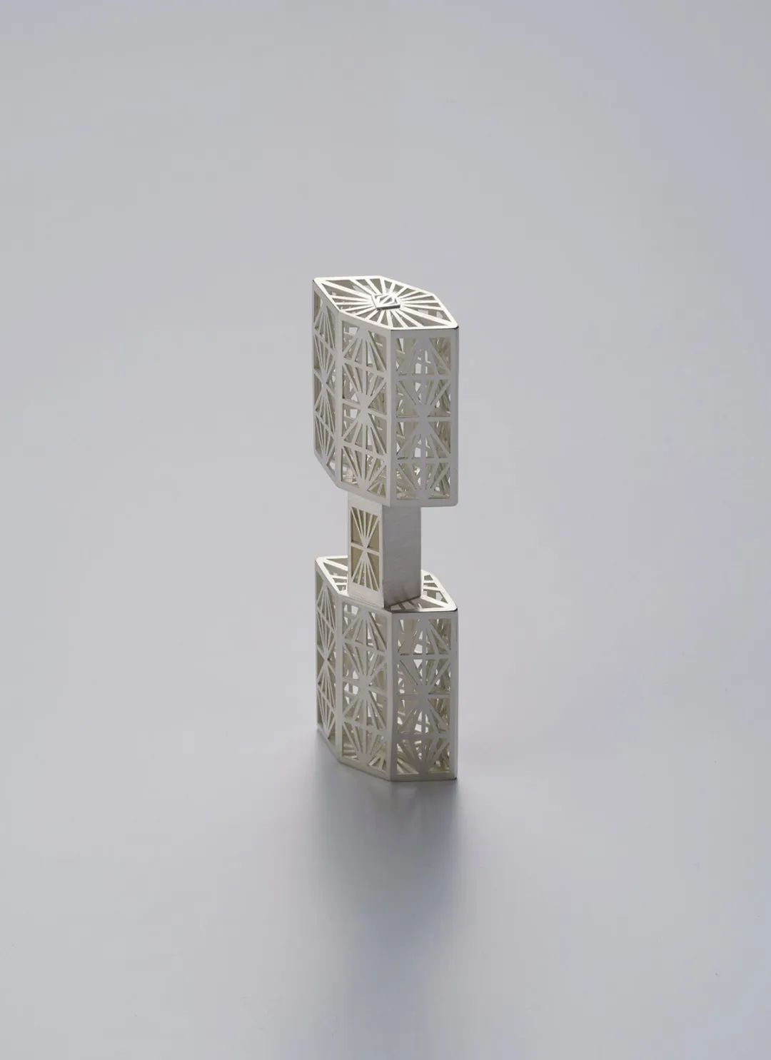 她的作品主要以自由塊體的形狀作為物體,裝飾是次要元素,可以充分表達(dá)吊墜、胸針或各種功能。這是基于她純潔的童年。她通過創(chuàng)造一個(gè)規(guī)則而穩(wěn)定的六角形結(jié)構(gòu)的虛擬空間,研究了在現(xiàn)代人焦慮的心靈中追求所需的穩(wěn)定和幸福的意義的作品。作品的主要形態(tài)是她童年記憶的圖像以及在結(jié)構(gòu)中重新發(fā)現(xiàn)的圖像。