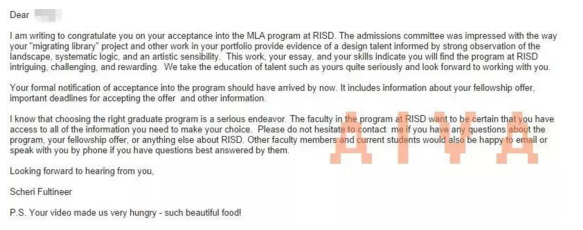在羅德島的offer正式到來之前,她便收到了系主任親自邀請的信函,極力希望她能夠去羅德島就讀??梢愿惺艿浇淌谘哉Z之間真的是非常希望收下這名徒弟呀!