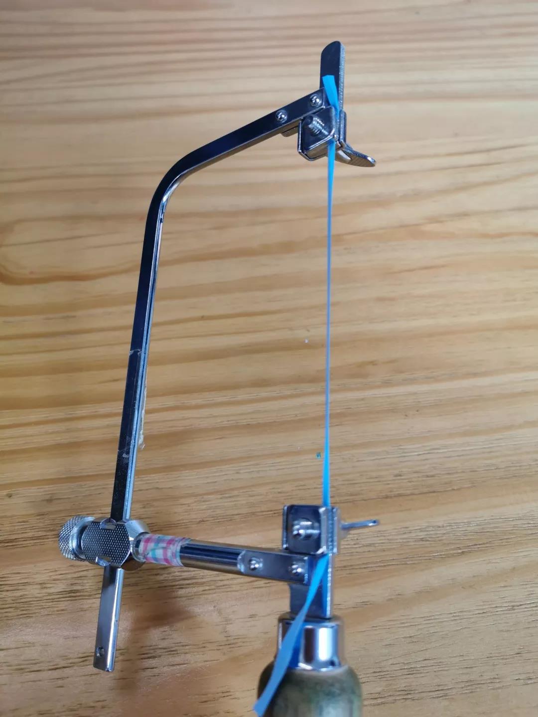 選擇一根拋光帶,與裝鋸條(不會(huì)裝鋸條的同學(xué)抓緊復(fù)習(xí))的方法一樣,將其裝到鋸弓上面,繃緊。拋光帶是有正反面的,可以將它縱向?qū)φ?,帶目?shù)的面朝外,也可以直接側(cè)過來拉平安裝。