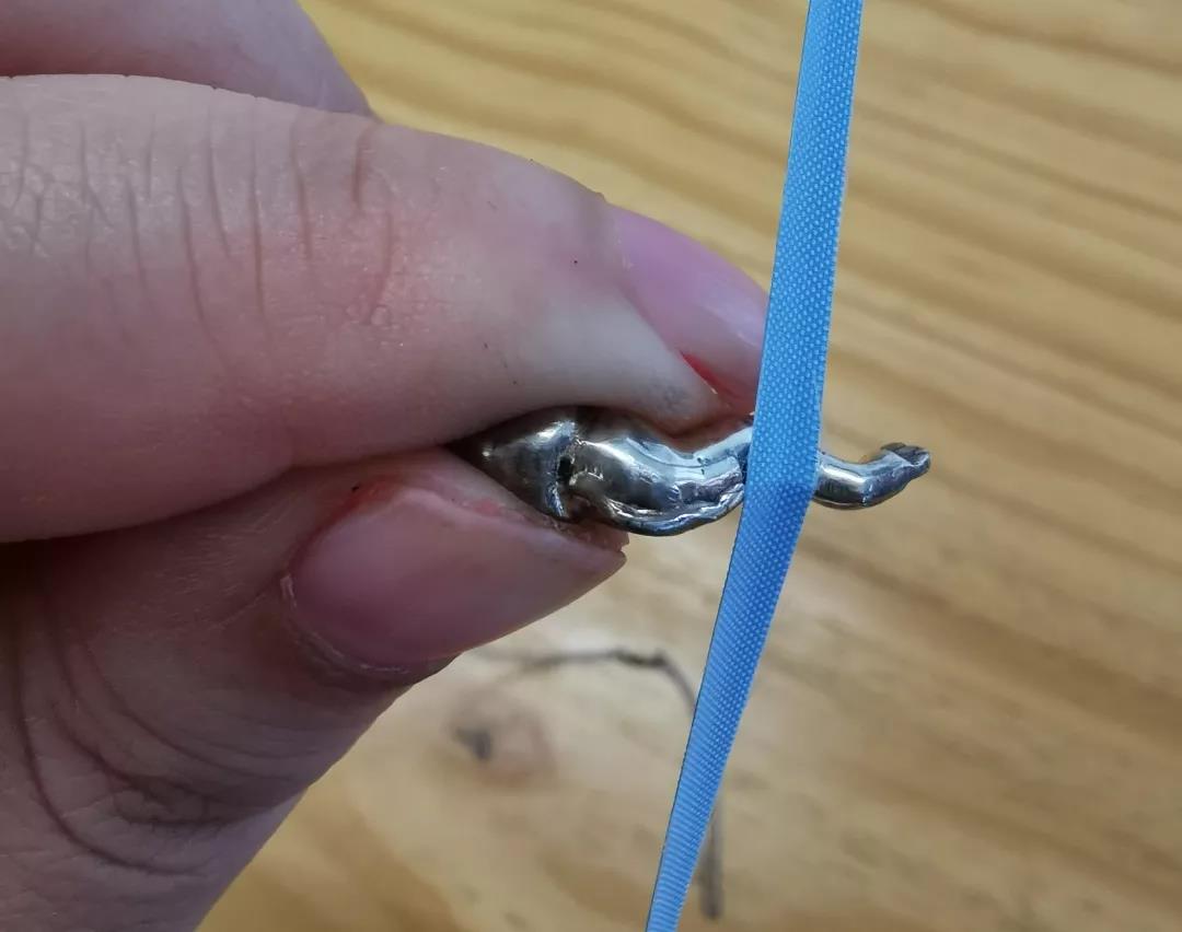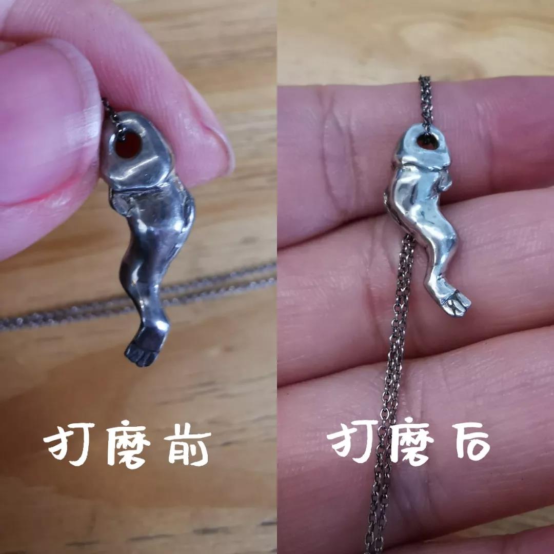 下面以曉辰老師的小魚干吊墜為例進(jìn)行效果演示,因?yàn)殚L(zhǎng)時(shí)間放置加上上海的強(qiáng)大濕力,小魚干吊墜表面已經(jīng)氧化暗淡了,拋光帶可以貼合小魚干表面的角度進(jìn)行打磨,如果拋光物件有孔洞造型,也可以像做鏤空切割時(shí)一樣將拋光帶穿過空洞進(jìn)行拋光。