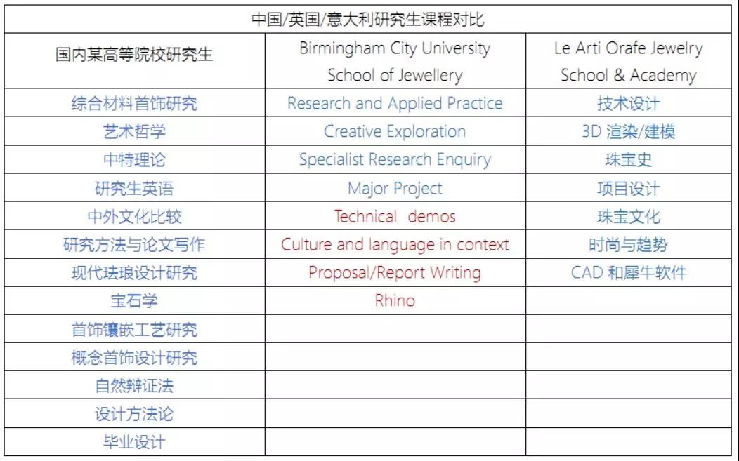 我們可以從下圖中看到伯明翰珠寶學(xué)院,與國內(nèi)高校首飾專業(yè),以及意大利歐納菲珠寶設(shè)計學(xué)院的研究生課程設(shè)置對比: