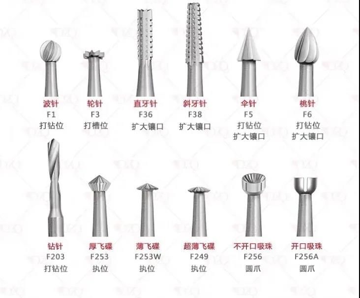 輪針——機用為主。針頭較大,造型豐富。適宜不同地方,不同面積的快讀刨削余蠟以及掏底工作,通常用于造型雕刻前的初步輪廓制作。
