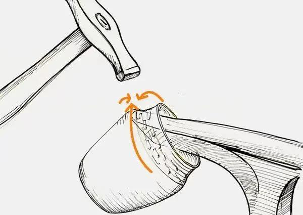 錘子或者窩鏨作用在金屬的力量可以使得器物造型向內(nèi)或向外彎折變化。鐵鉆、木塊等金屬的背景墊底,或者是錘子,窩鏨等成形工具的使用也影響著器物成型。錘擊點(diǎn)的把握是金屬鍛敲成形時(shí)最為關(guān)鍵的重要控制,不同的敲擊點(diǎn)直接影響著成形。