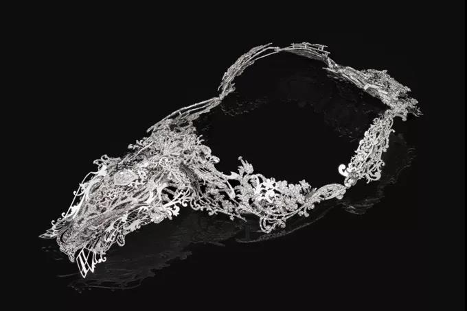 “田口史樹(shù)通過(guò)對(duì)主題和材質(zhì)的巧妙處理,重新詮釋了胸針和吊墜。他的首飾似乎被精美的寶石所迷惑,通過(guò)不同的切割和角度折射出線條,藝術(shù)家通過(guò)將純銀雕鑿成一種模擬鉆石等寶石的光澤來(lái)達(dá)到這種效果。田口對(duì)銀的使用指向首飾價(jià)值的建構(gòu),暗示銀與貴重的巖石一樣光芒四射。田口曾說(shuō):“在不鑲嵌任何寶石的情況下,我常常使用制作寶石的結(jié)構(gòu)來(lái)呈現(xiàn)金屬本身的力量和精致感。”胸針和吊墜類似于家族徽章或盾徽;通過(guò)破壞物質(zhì)象征和清空徽章的肖像,胸針成為超越舊血統(tǒng)的新型關(guān)系的容器。”