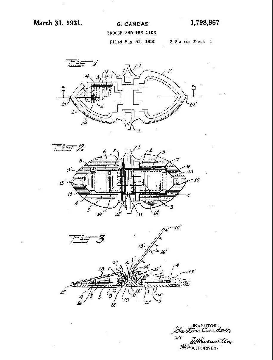 到30年代,法國巴黎公司Gaston Candas受到可拆分結(jié)構(gòu)的啟發(fā),發(fā)明了對(duì)夾的機(jī)械設(shè)計(jì),即一件胸針可拆卸為兩件對(duì)夾。他們把這一設(shè)計(jì)帶到了美國,風(fēng)靡一時(shí)。Dress Clip迅速成為了“人們必須擁有的時(shí)尚單品”。