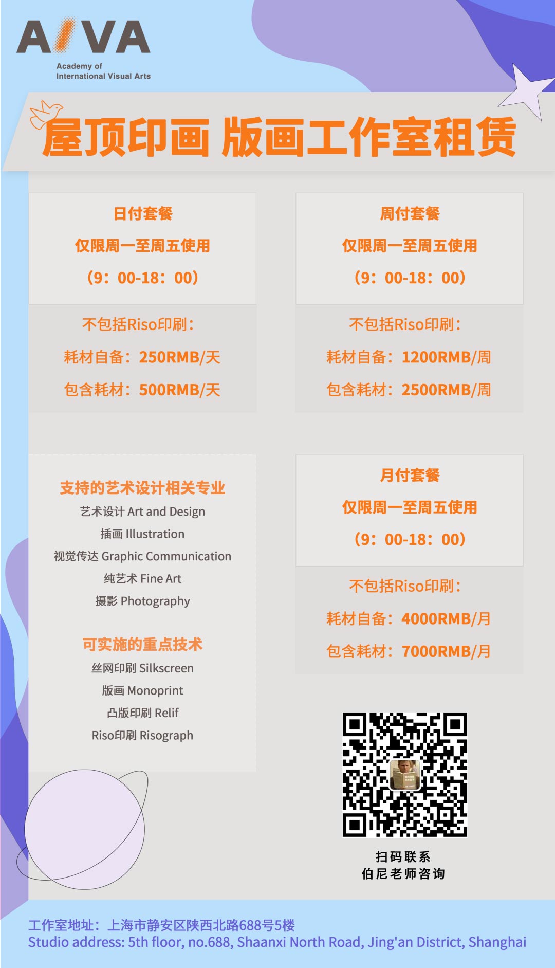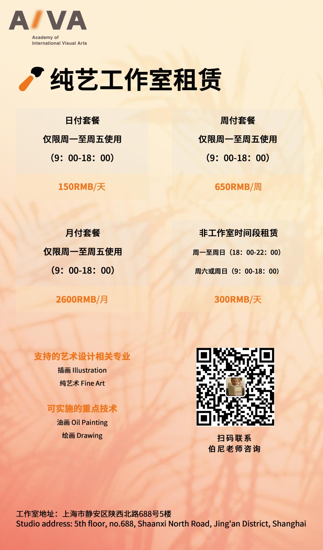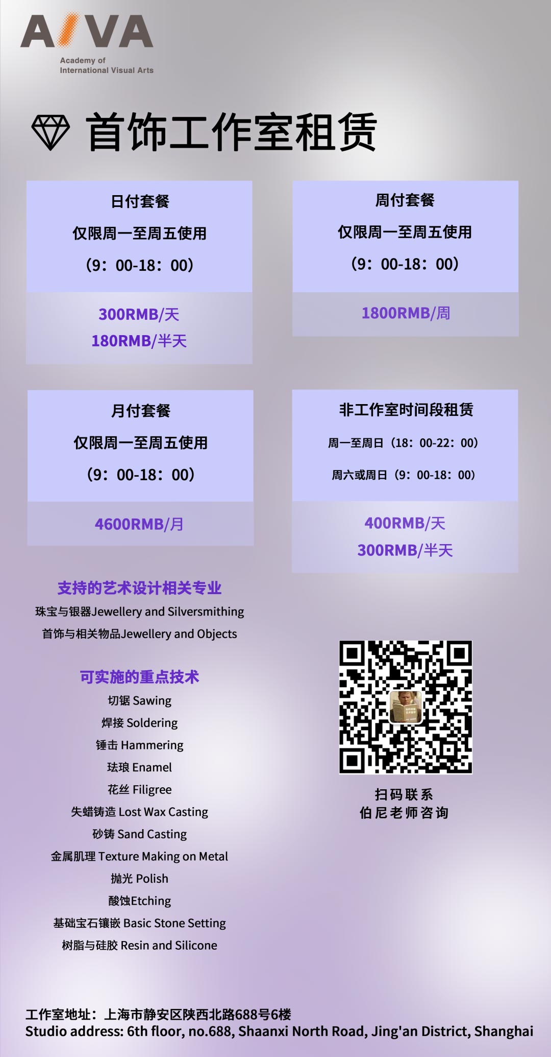 2. AIVA往屆學生可享7折優(yōu)惠使用工作室(包含往屆預科、藝術作品集、背景提升課程、首飾設計1v1課程學生)。