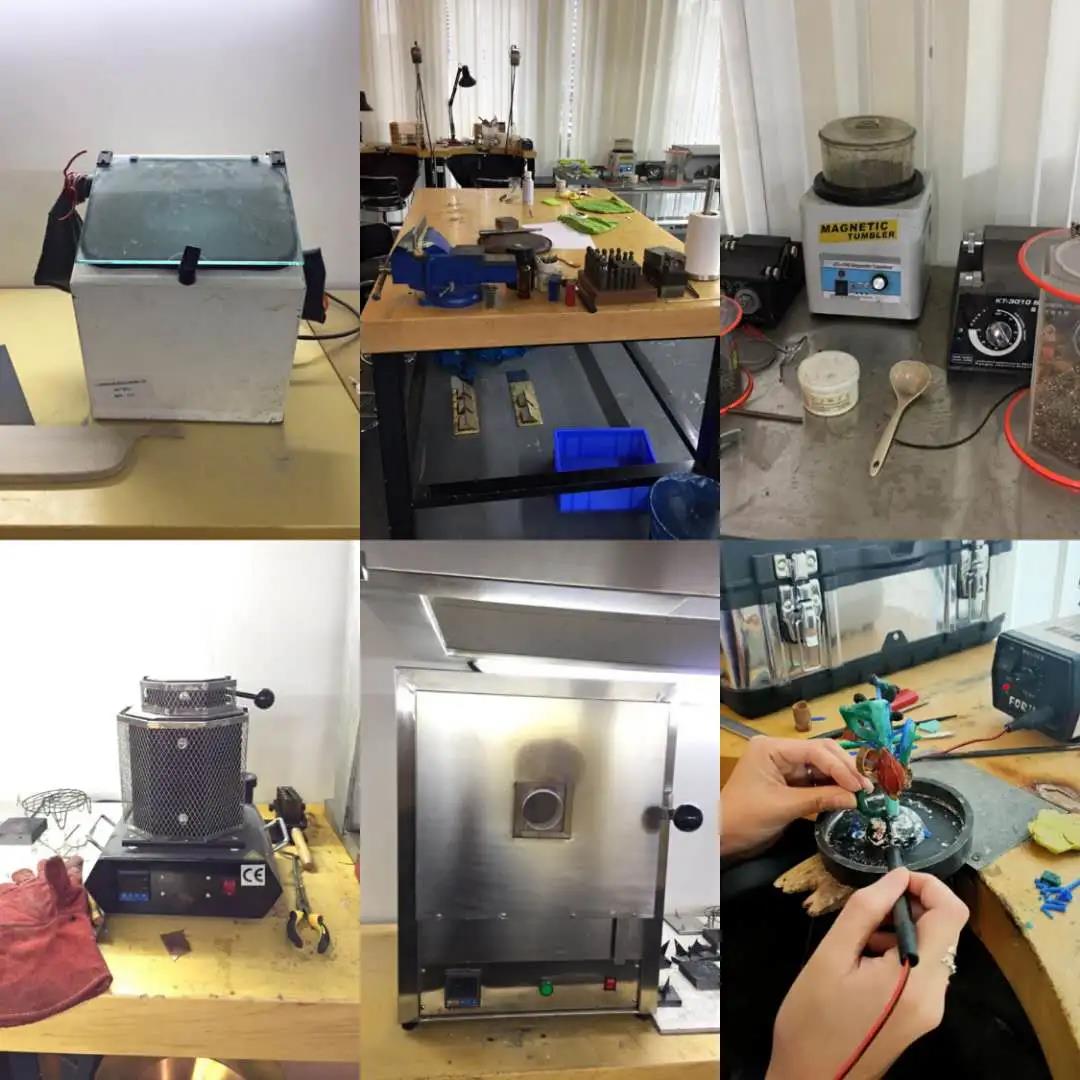壓片機(jī) Rolling Mill • 超聲波清洗機(jī) Ulrasonic Cleaner • 熔焊機(jī) Soldering Machine • 電焊機(jī) Point-Welding Machine • 酸洗鍋 Pickle Tank • 棉綸拋光機(jī) Polishing Motor • 磁針拋光機(jī) Magnetic Tumbler • 滾動(dòng)拋光機(jī) Single Barrel Tumble • 鉆臺(tái) Drilling Machine • 噴砂機(jī) Mini Sand Blaster Machine • 大小琺瑯爐 Large and Small Kilns • 熔金爐 Metal Melting Furnace • 抽真空鑄造機(jī) Vaccume Casting Machine • 油壓機(jī) Hydraulic Press • 大桌剪 Bench Cutter • 平拋機(jī) Lapping/Polishing Machine • 小型砂帶/沙盤機(jī) Mini Sand-Belt Machine