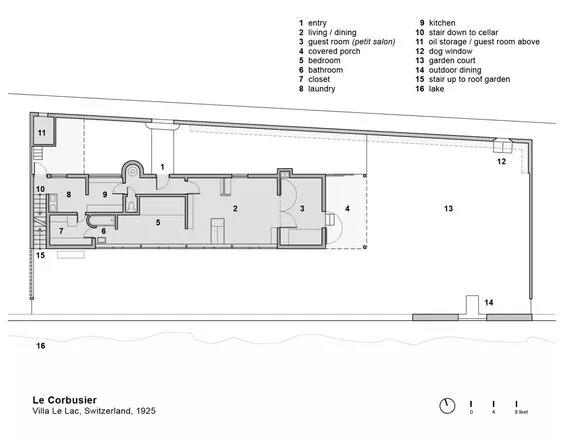 因為是給年邁的父母建造的,因此柯布西耶并沒有追求過大的空間,而更著重于舒適、寧靜和自然的環(huán)境。這個獨棟住宅座向基本正南正北,起居室里擺放著母親心愛的鋼琴和可以調(diào)節(jié)長度的餐桌。屋頂花園與地面的庭院、遠處的湖光山色相互呼應(yīng),提供了多層次的景觀體驗。(屋頂花園后來也成為了柯布西耶重要的設(shè)計要素之一。)