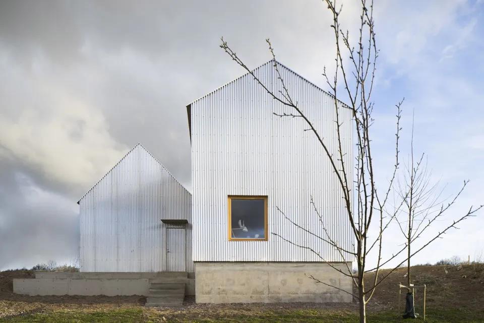 "House for mother" 整棟房屋分為兩個長方形區(qū)塊,以不對稱造型構(gòu)造出350平米的狹長空間。房屋外墻包覆著一層波紋鋁板,使得房子隨著日光照射的變化,呈現(xiàn)出有趣的光影效果。