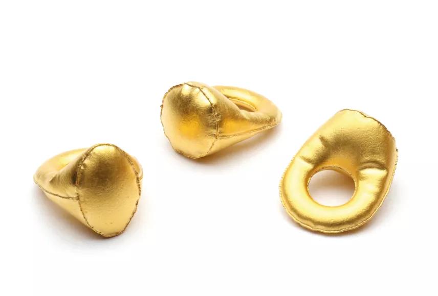 丹麥?zhǔn)罪椝囆g(shù)家Kim Buck對于黃金的運(yùn)用則變成了其象征性的首飾語言。他早期的<Inflated>和<Puffed Up>系列中,他向我們展示了他高超的技術(shù)——將黃金制成極薄的片然后縫制在一起,就好像冷硬的金屬真的像氣球一樣被吹了起來。
