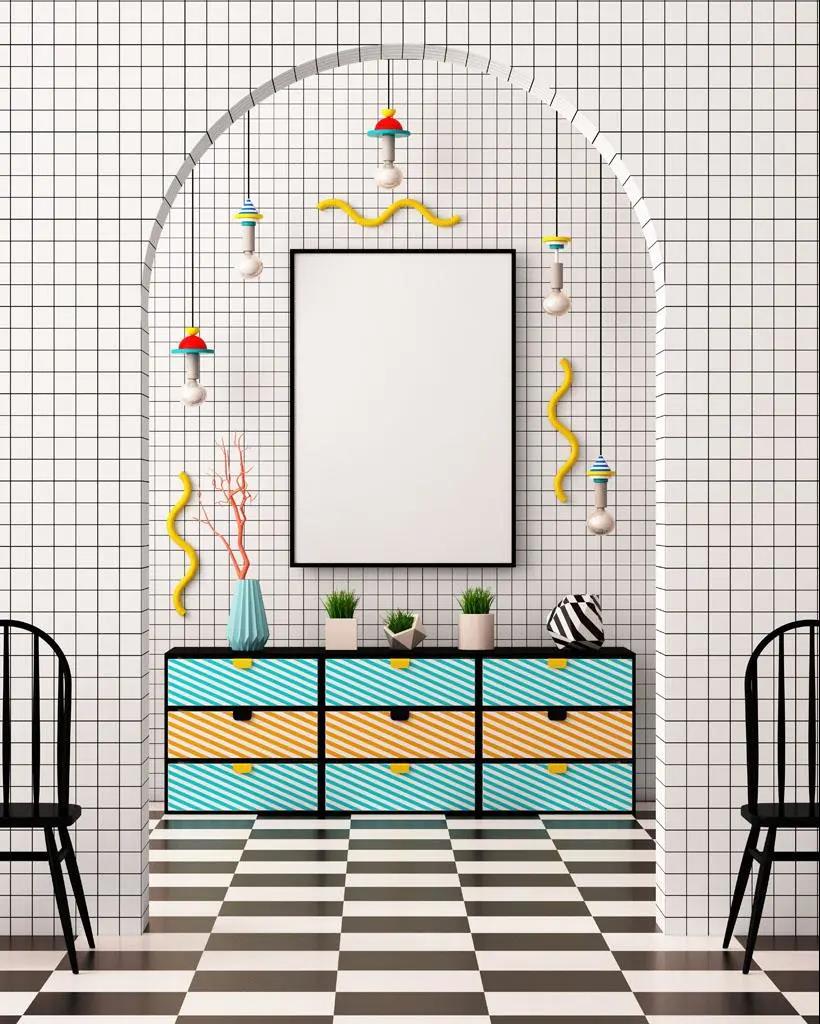 實際上孟菲斯的風格在最一開始的時候并沒有得到廣泛的認可,而真正流行起來還是在埃托索特薩斯(Ettore Sottsass)去世之后。與包豪斯風格中看似無規(guī)則而實則有序的結構比例相比,孟菲斯在這樣的基礎下,顯得更為無秩序,同樣是點線面,孟菲斯的設計里體現(xiàn)出的更多的是兒童般的隨性和快樂。你很難不從圖形上色彩上聯(lián)想到,小時候吃的糖果或者是玩的玩具,也因此這種抓眼球的活力感也被大量的運用到了廣告、平面設計、產(chǎn)品設計、服裝設計的概念里。