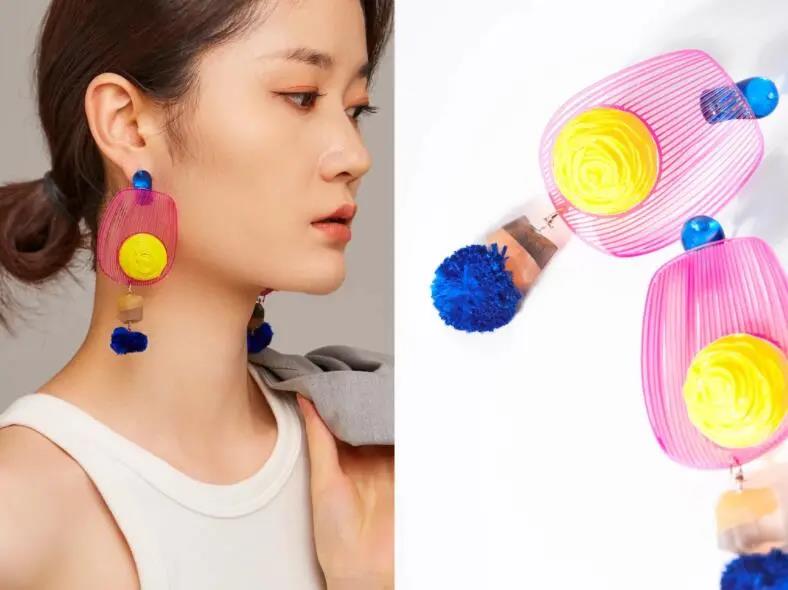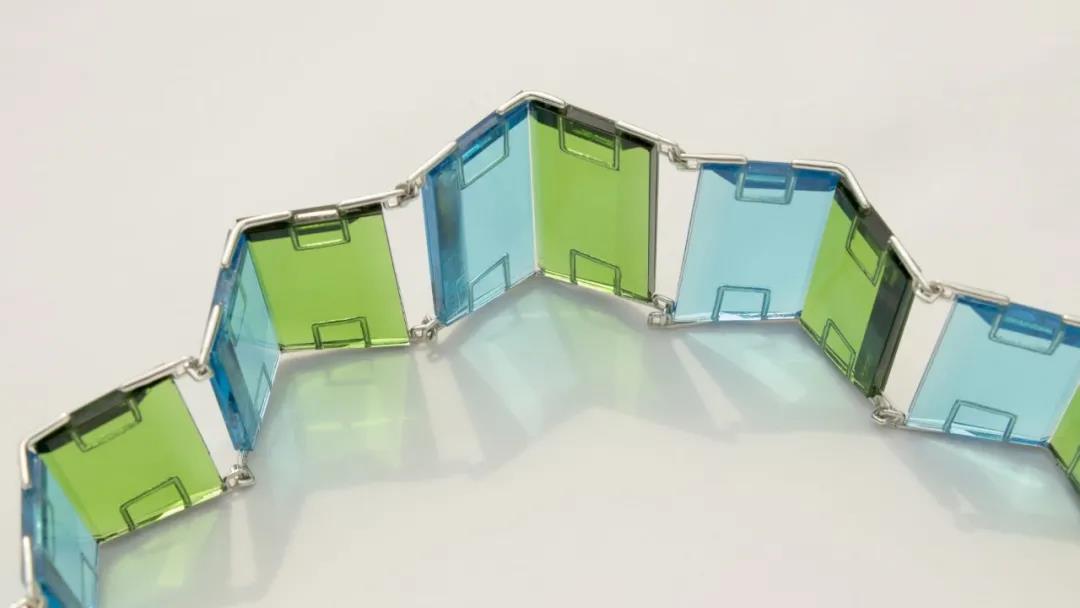 從活力耀眼的紅與黃,到平靜放松的藍(lán)與綠,每一件首飾都在觀者眼前構(gòu)成了一幅生動的想象圖景:日出,海灘,春天,草坪…… 當(dāng)藍(lán)與黃交織時,若隱若現(xiàn)的綠色在耳邊浮現(xiàn),不禁讓人聯(lián)想起夏日清涼的雞尾酒。伴隨著光影變幻和色彩嬉戲,首飾所創(chuàng)造的互動空間微妙地影響著人們的情感體驗(yàn)。
