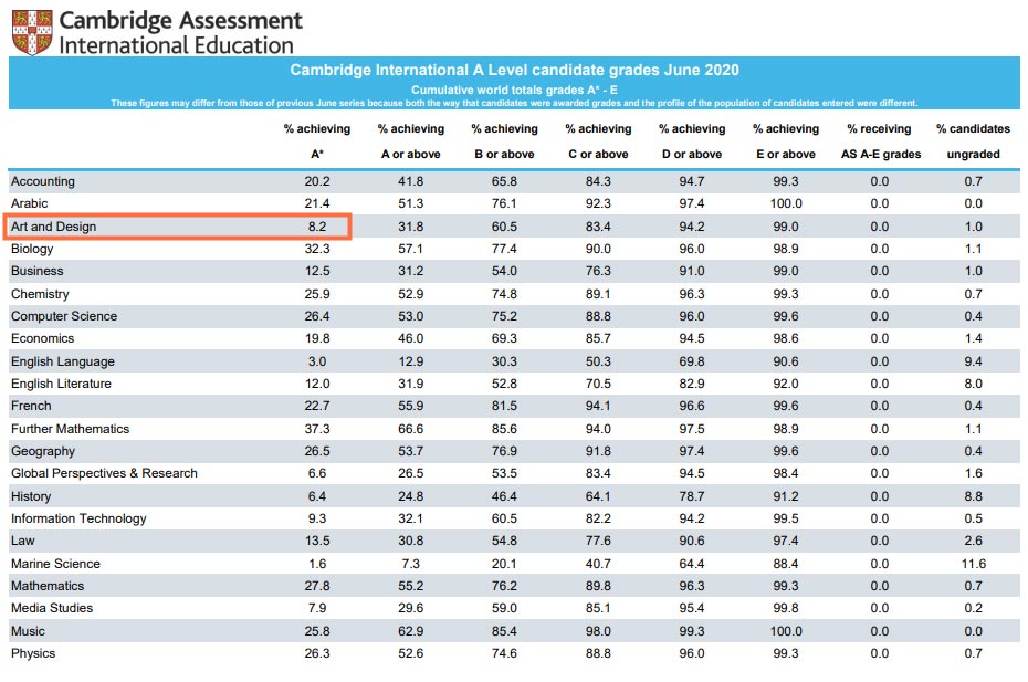 A-Level課程共有70多門科目,科目間高分率也有一定的差異,相對(duì)于A*率高達(dá)20%的生物、數(shù)學(xué)等科目,藝術(shù)和設(shè)計(jì)科目拿到A*的概率則低很多,2020年CAIE統(tǒng)計(jì)只有8.2%。