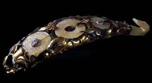 “包金鑲玉銀帶鉤”正是這一時期利于鎏金工藝和鑲嵌工藝制成的一件做工精細、華麗的典型帶鉤。此時我國的鑲嵌技術中已經(jīng)將當今的爪鑲工藝和雕刻造型結合的精巧絕倫。從這件帶鉤中,我們完全可以一窺我國戰(zhàn)國時期鑲嵌技術的制作工藝與水平。