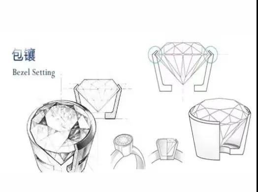 包鑲是指通過推壓立起的金屬邊將寶石的腰圍包裹起來的鑲嵌方法。包鑲的鑲口主要是由底部襯片和立起的金屬邊組成的,金屬邊能夠起到包貼寶石的作用。