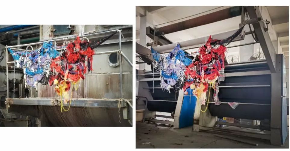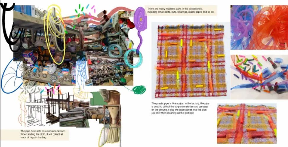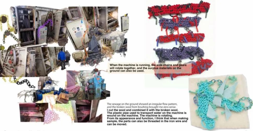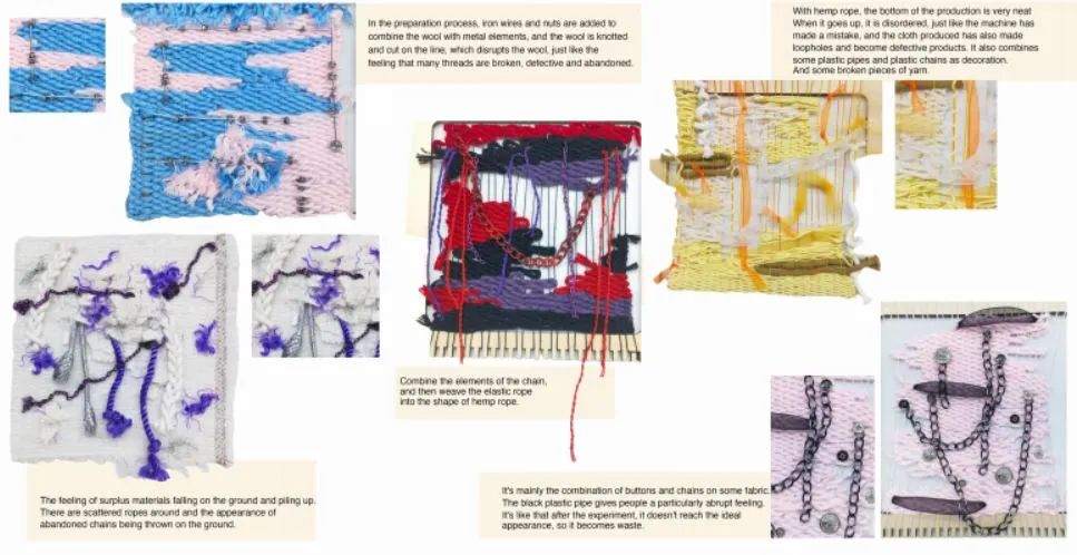 我用塑料材質(zhì)(塑料管、泡泡紙)、金素材質(zhì)和網(wǎng)狀材料來(lái)代表污染物,給他們?nèi)旧?,用一些毛線、碎布、紗線、毛氈來(lái)表現(xiàn)植物的質(zhì)感,將這兩種反差很大的材質(zhì)通過(guò)編織、縫線等等的方式結(jié)合到一起,來(lái)體現(xiàn)我的主題,污染和自然環(huán)境互相滲透。