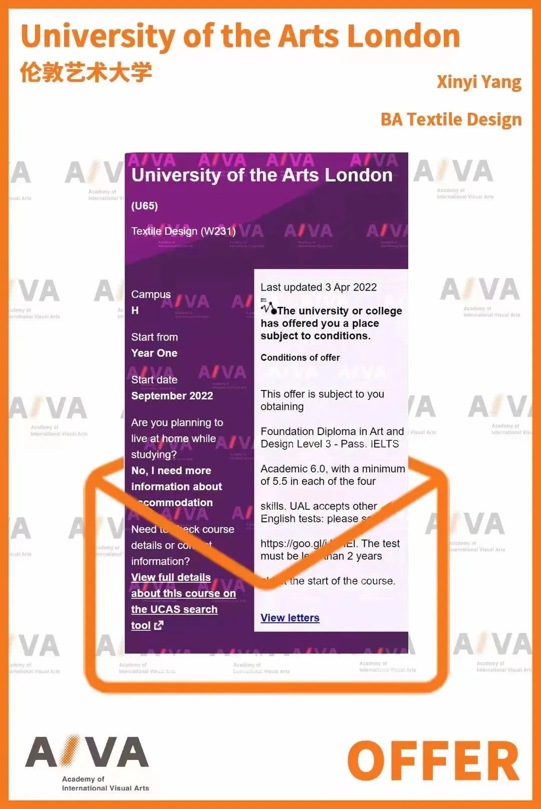 上周四,AIVA本科預(yù)科服裝專業(yè)學(xué)生Xinyi參加了UAL線上面試,順利拿到了切爾西王牌專業(yè)——紡織設(shè)計(jì)的offer,讓AIVA所有老師都倍感激動(dòng)!而更多的offer還在飛來(lái)中~