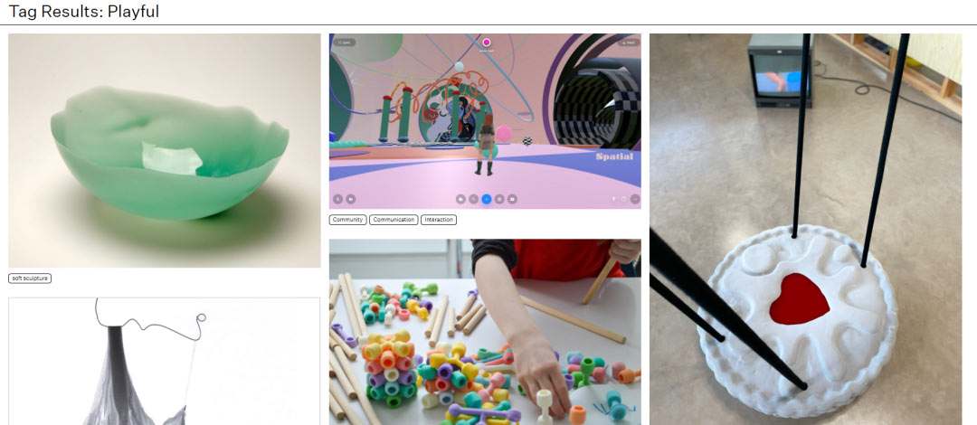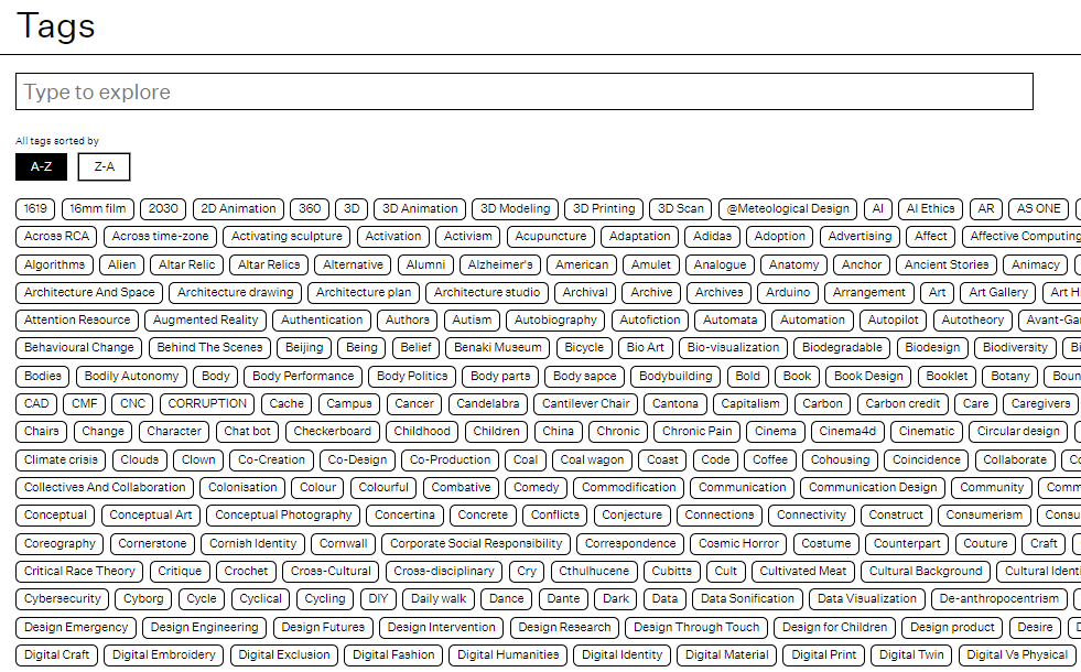 標簽已經(jīng)成為現(xiàn)代人檢索信息的最快捷方式之一,RCA2022畢業(yè)展也提供了以標簽作為入口的觀展方式:“3D”、“AI”、“生物藝術”、“空氣”、“鍵盤”、“藍色”.......在多達2000+的標簽中,你可以選擇任何感興趣的話題、作品類型甚至顏色,看一看RCA的學生如何闡述與演繹?