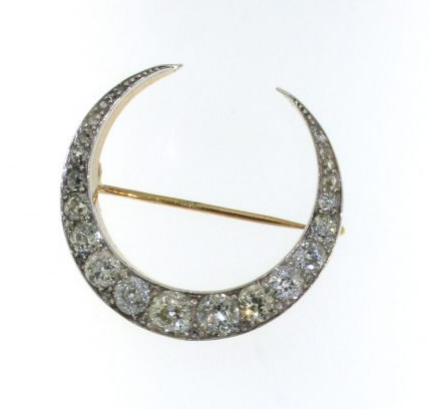 鑲嵌鉆石的新月胸針和發(fā)飾也非常流行。新月象征著月亮女神,人們藉此紀(jì)念19世紀(jì)末期女性被賦予更多社會(huì)權(quán)利。維多利亞時(shí)代的新娘在度蜜月時(shí)會(huì)佩戴帶有新月形花朵的胸針,因此得名“蜜月胸針”。這些寓意來(lái)源于新月美麗和女性氣質(zhì),以及古代星星引導(dǎo)旅行者回家這一意義。