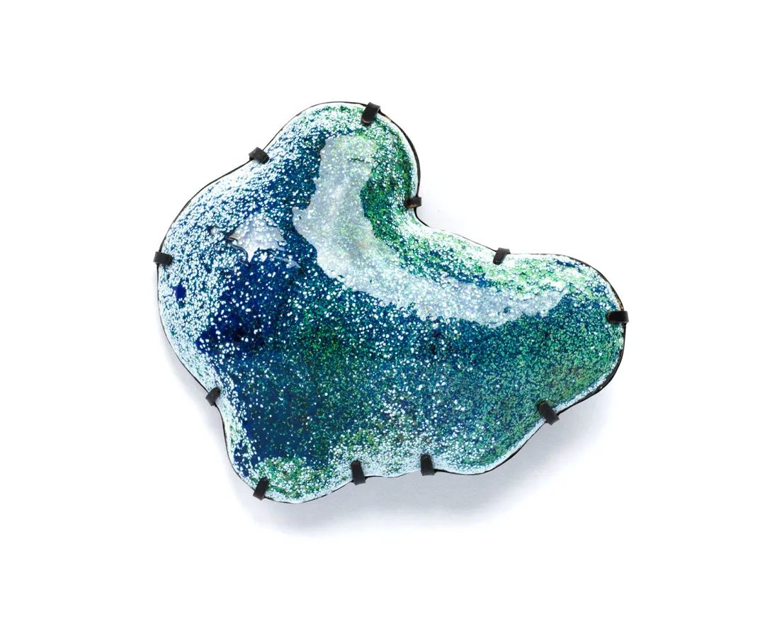 與傳統(tǒng)珠寶作品中寶石與構(gòu)成結(jié)構(gòu)支撐的貴金屬相輔相成不同,這些作品中,寶石以薄片的形式被分層重疊,形成對比鮮明的不透明部分,然后使用彩色樹脂將它們連接在一起,制作成為整個胸針。
