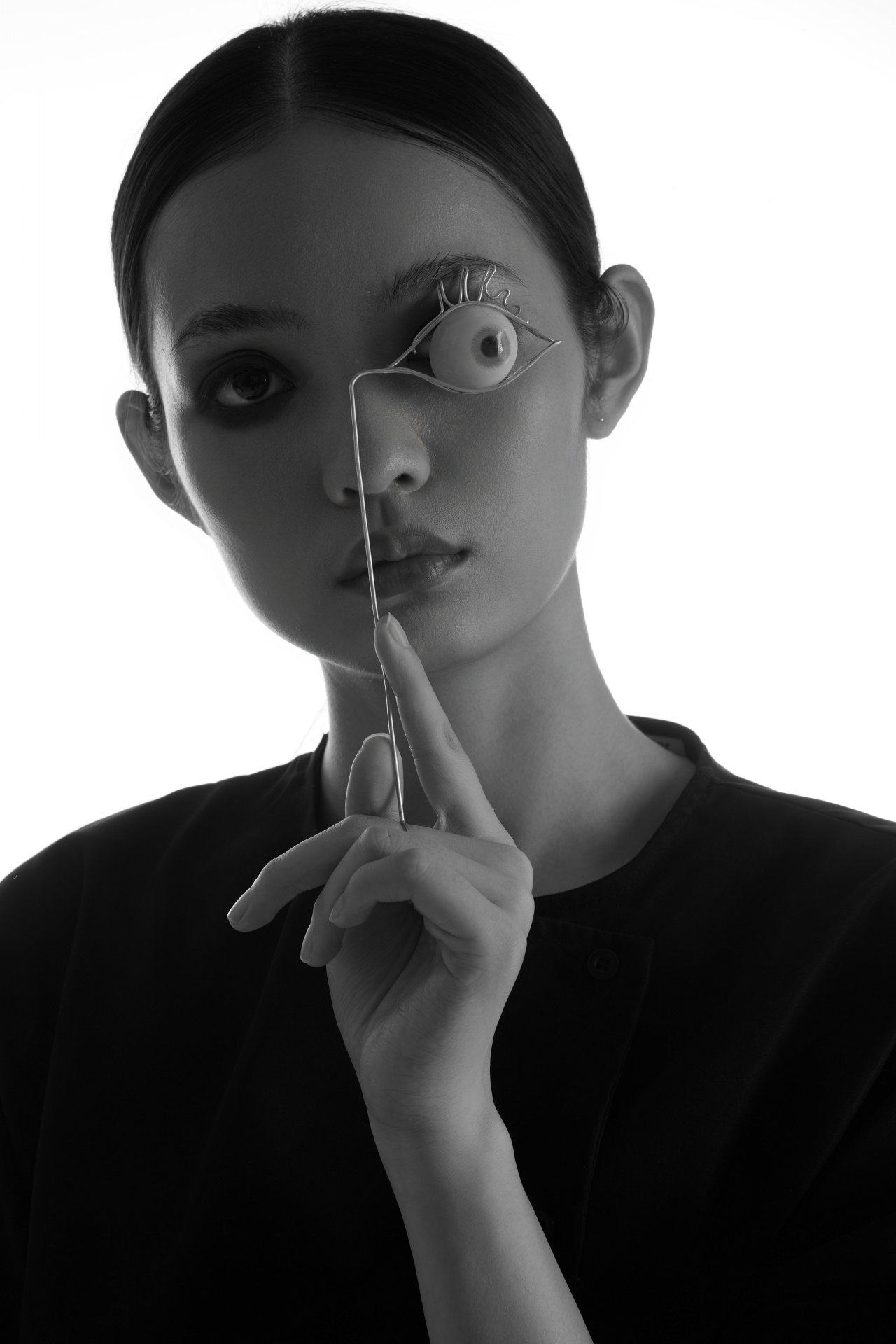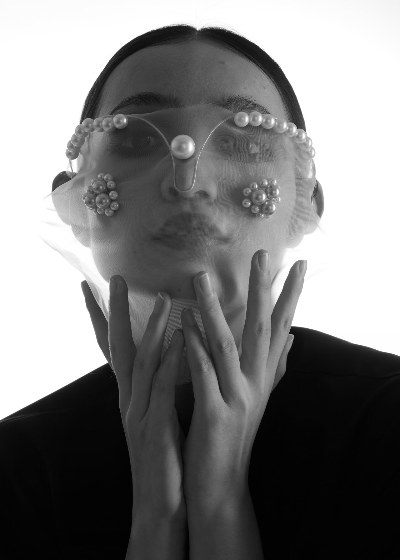在《保護(hù)色》這系列作品中,我以化妝為出發(fā)點(diǎn),創(chuàng)作了一系列可佩戴的面紗首飾。我從化妝教程中獲得靈感,使用銀絲概括臉型和五官的形狀,用白紗覆蓋面部,并用珍珠點(diǎn)綴高光和腮紅。我還運(yùn)用粘土和金屬制作了可替換的美瞳和假睫毛,這些部分來(lái)自于我對(duì)同學(xué)妝容的夸張觀察。當(dāng)我佩戴這系列自帶妝容的首飾時(shí),會(huì)給我?guī)?lái)安全感,就像變色龍的保護(hù)色。