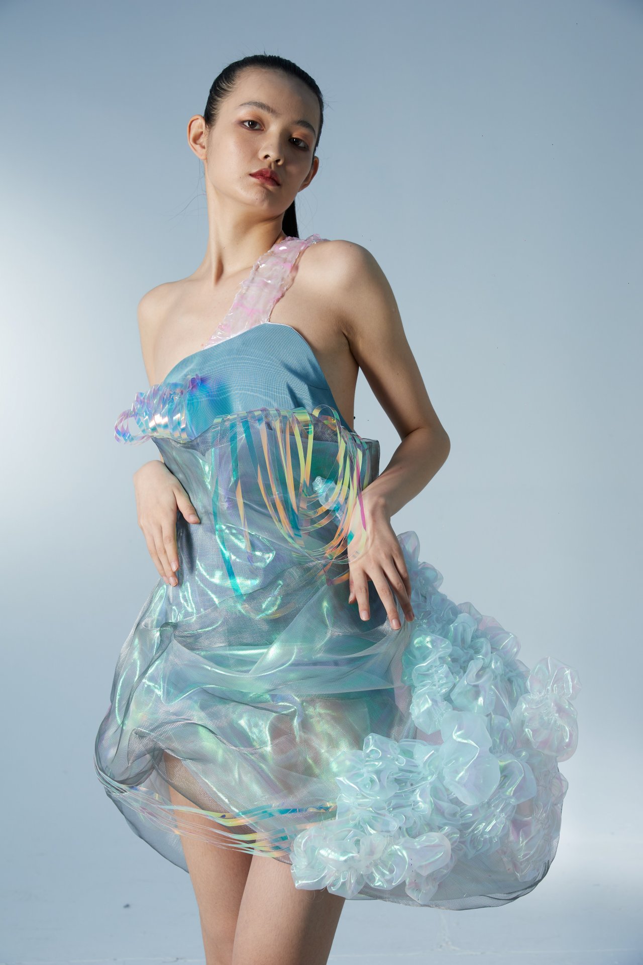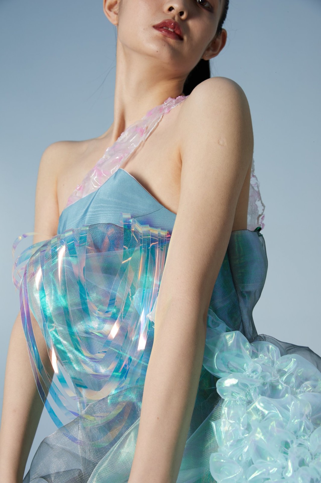 <Through The Window> was inspired by paintings of a German realistic oil painter, Jochen Mühlenbrink. The foggy window in his work blurred the boundaries between reality and illusion. Such visual effects and playful expressions impressed me because I also love drawing on car windows on foggy rainy days, as well as observing the hazy scenery and scattered distorted lights through the brushwork and dripping water. Therefore, I try to present those sensations through bubble water, gauze, and various translucent fabrics. For example, I used elastic thread to sew bubble shapes on laser organza, ironed gauze to create bubble-like shapes, used moleskin fabric for the lining, and embellished the garment with laser TPU. I blew bubbles on different materials to leave a watery pattern, using the same method I also create the silhouette of the garment. I hope the wearer and audience could enjoy the hazy beauty.