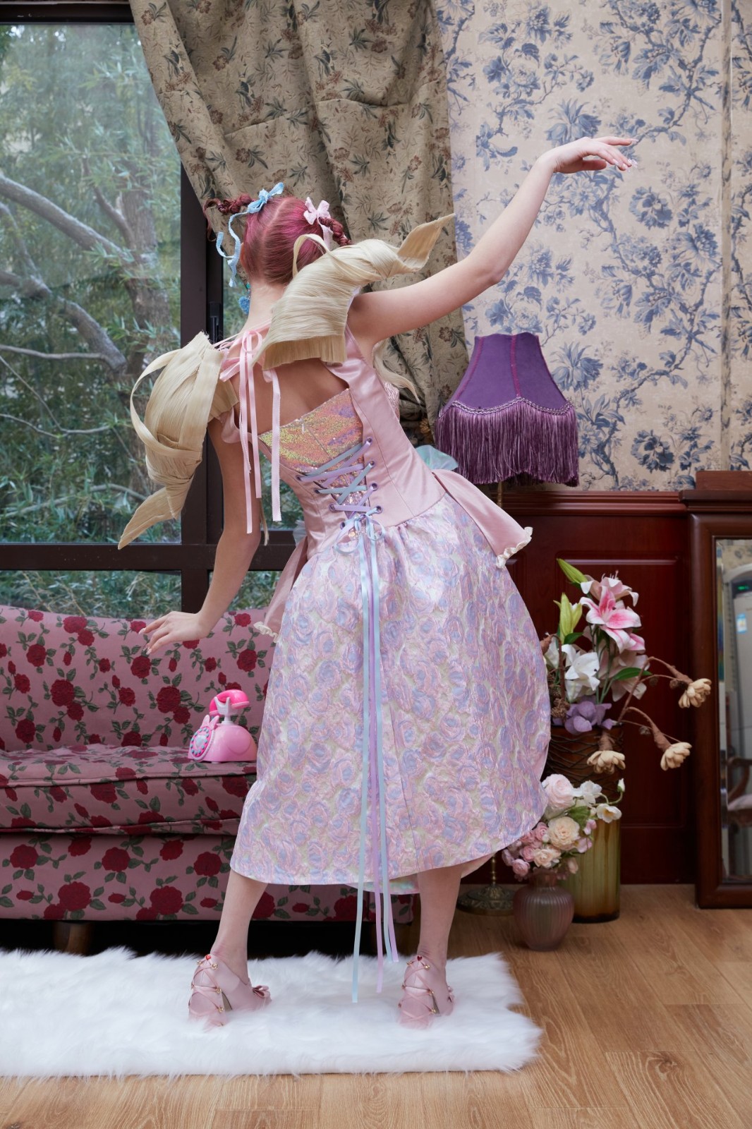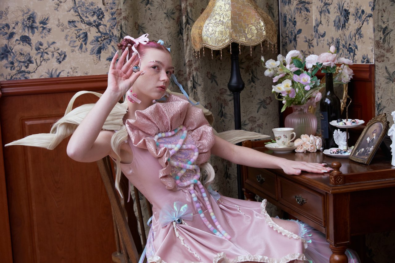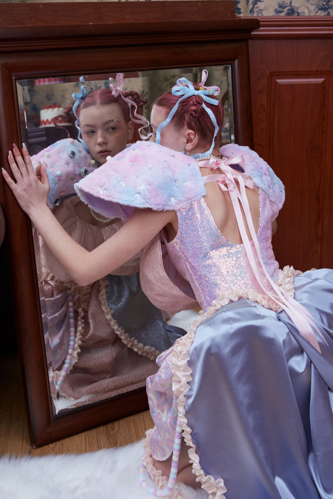 在《女巫娃娃》中,我以夢(mèng)為靈感結(jié)合梅蘭妮 馬丁內(nèi)茲(Melanie Martinez)的音樂電影《K-12》中即甜美又古怪的風(fēng)格去展示社會(huì)對(duì)于女性的物化與霸凌。我嘗試了使用非常規(guī)材料去展現(xiàn)部分服裝,例如:假發(fā),眼睛,牙齒,粘土等等。最后我設(shè)計(jì)制作完成兩套成衣。成衣的拍攝選擇一個(gè)“復(fù)古”的別墅中的置景,來比如社會(huì)對(duì)女性的固有印象與看不見的禁錮枷鎖。