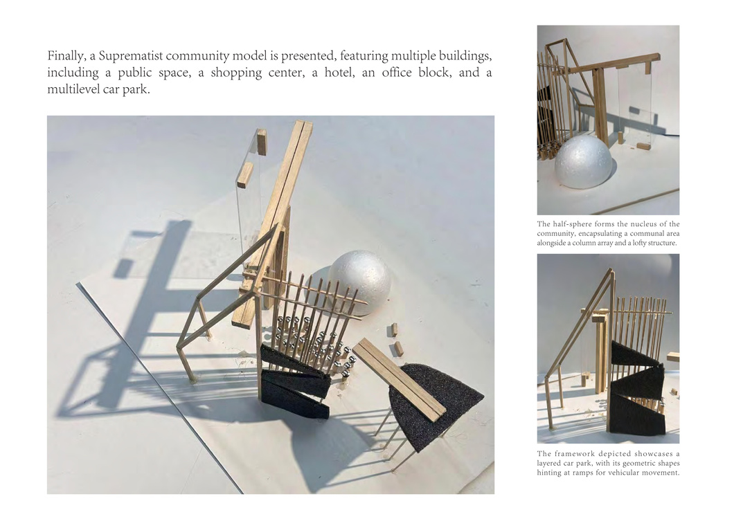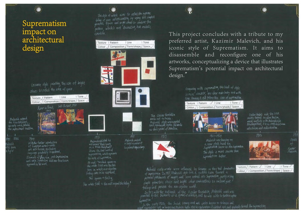 The <Suprematism Impact on Architectural Design> concludes with a tribute to my preferred artist, Kazimir Malevich, and his iconic style of Suprematism. It aims to disassemble and reconfigure one of his artworks, conceptualizing a device that illustrates Suprematism's potential impact on architectural design.”