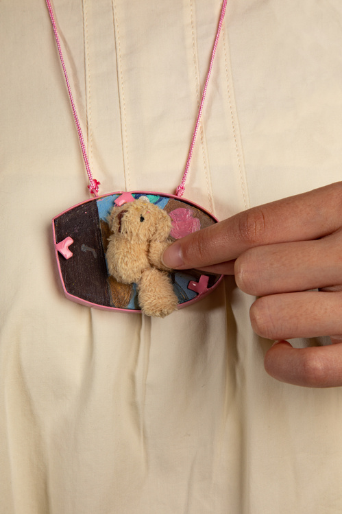 這些玩偶我想到美好的事和人,他們或許也會因為各式各樣的原因離開我,但他們給我?guī)淼挠绊憣恢贝嬖凇?這些寶貴的回憶會通過一張照片,一幅畫像,或者意見作品得以保存,就像《畫框中的朋友》系列一樣。也希望這件作品也能喚起觀眾記憶中曾邂逅的美好之物,我想這也正是首飾的意義之一。