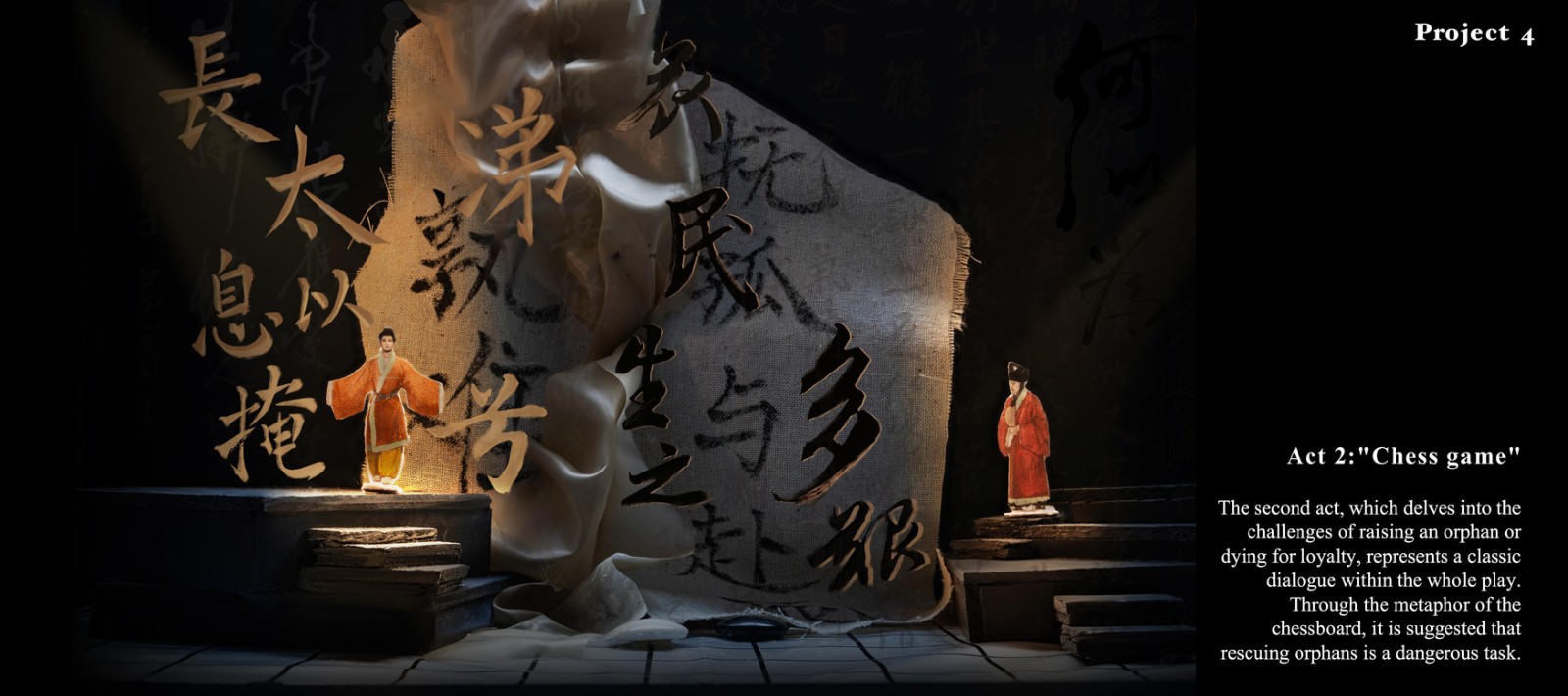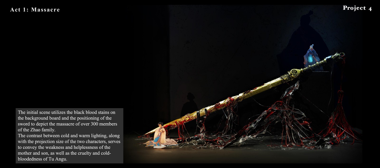《趙氏孤兒》標志著我學習經(jīng)歷的頂峰。 我通過投影和燈光效果增強了舞臺效果,放大了悲慘的氣氛。這部中國傳統(tǒng)戲劇探討了忠誠、犧牲和正義的主題,描繪了與邪惡勢力的長期斗爭。以主角為代表的正義力量,在復仇的過程中付出了慘痛的代價。