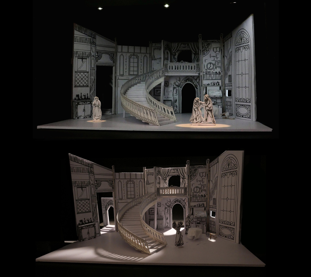 《當你老了》這個項目讓我能夠制作不同的場景來展示愛情在各個階段的進展:相遇、求婚和老年。 盡管我發(fā)現(xiàn)這個項目對我來說具有挑戰(zhàn)性,但它使我加深了對敘事詩意意象的理解。除了為古典文學設計舞臺之外,我還為《愛麗絲夢游仙境》設計了一個非傳統(tǒng)的舞臺,融入了鮮艷的色彩和鏡子等元素,讓觀眾沉浸在愛麗絲的魔法世界中。此外,在描繪19世紀女性悲劇《朱莉小姐》的過程中,我加強了塑造白模的技能。通過對細節(jié)的審視,文本與模型的區(qū)分成為一種旨在對比社會地位的雙層建筑設計,最終象征著主人公的困境。我的目標是通過打造這個經(jīng)典舞臺來強調(diào)女性角色的力量和獨立
