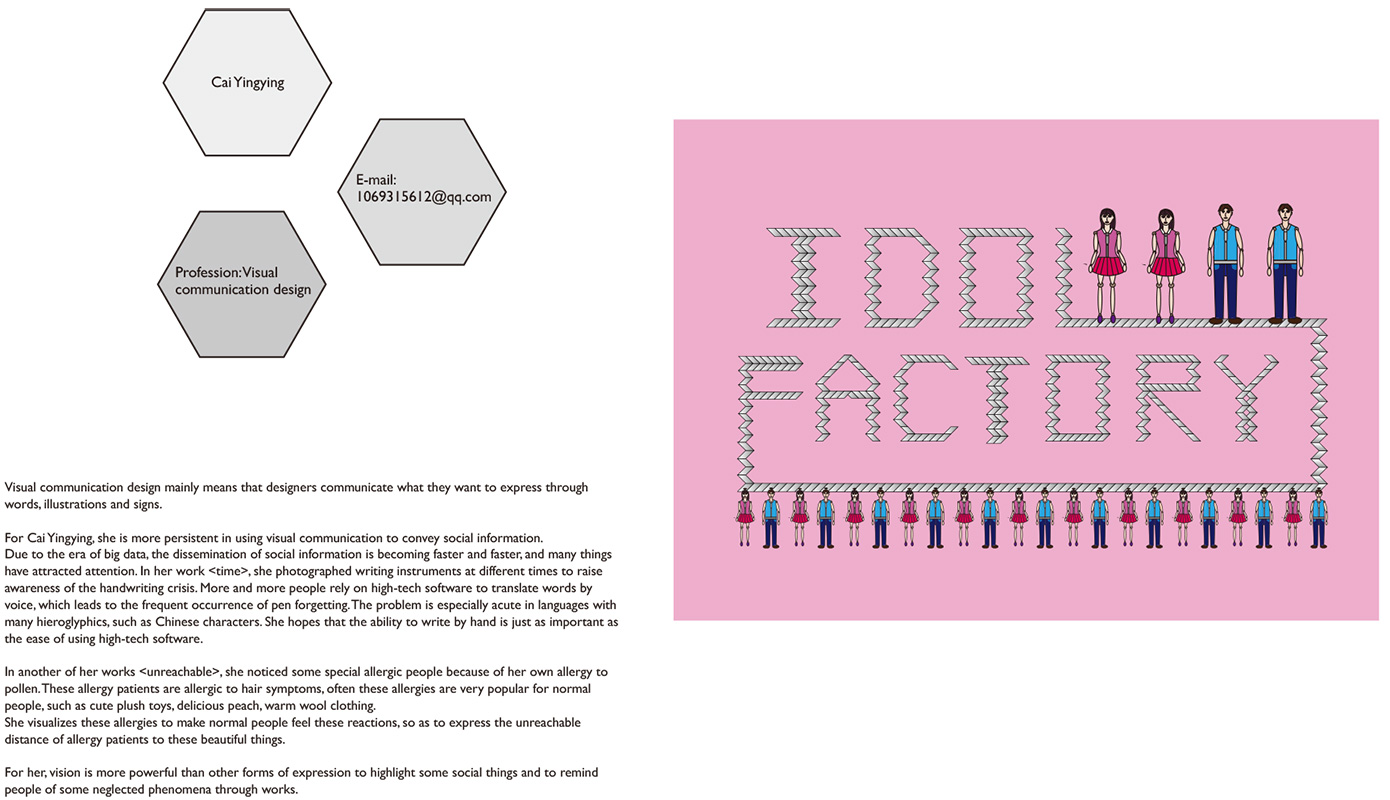 Visual communication is a way for designers to show what they want to express through visual elements. For Yingying Cai, using visual communication to convey social information is what she persists to do.