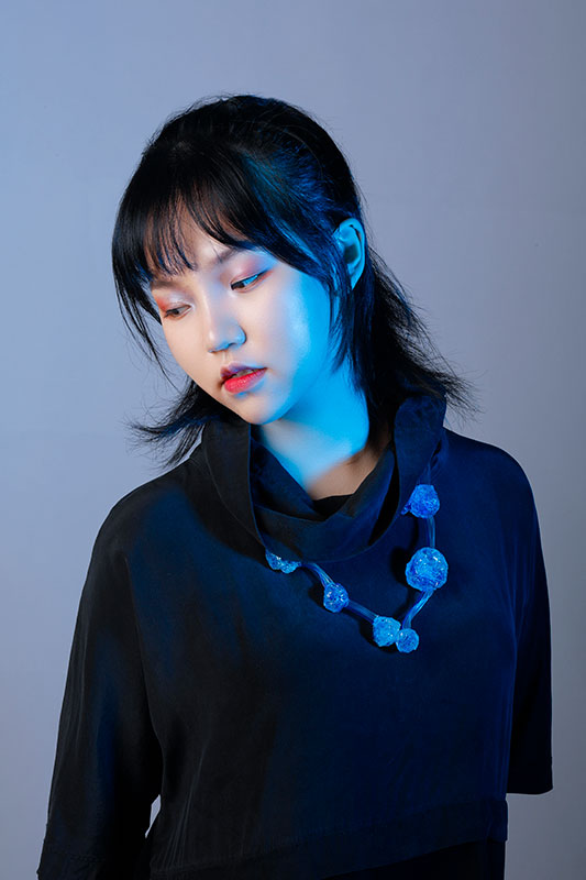 In my work <Translucent>, the concept comes from the sense of light transmission of plants beneath the illumination of light. I hope to highlight the semi- translucent texture, so I used transparent UV resin to shape the three necklaces. At the same time, I added bright colour from a special liquid resin. The <New self> is a series that I made to emphasize the breakthrough moment, which is also the reason why I adopted the mirror pieces by resin to fix the mirror and to make a desired state without affecting the reflection of the mirror.