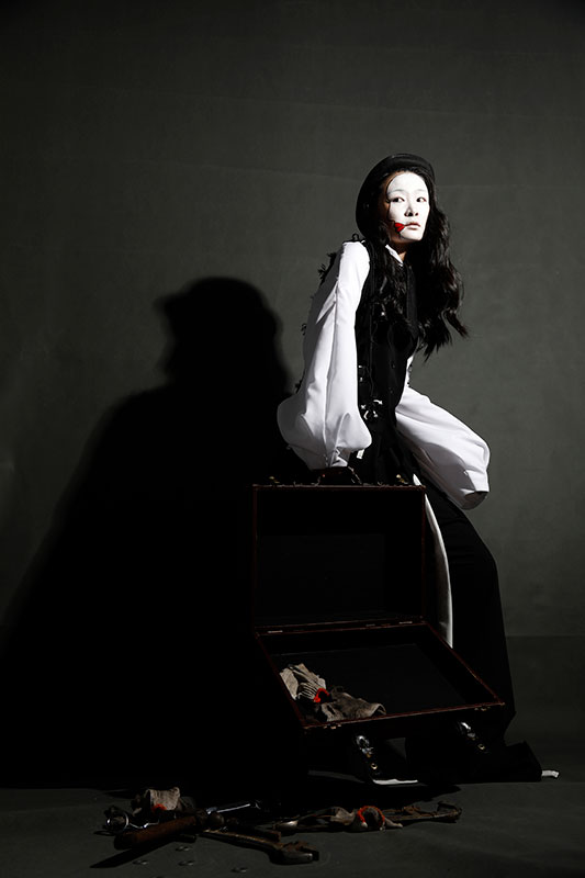在<喜劇>的系列中,她受到喜劇電影和綜藝節(jié)目的啟發(fā),她從這些節(jié)目中感受到了辛酸。因此,她從另一個(gè)角度思考了喜劇的真正含義,并探討了人們生活中忽略的方面。她調(diào)研了1930年代的服裝。上層人物的著裝和底層人物所穿的材料是非常精致的。她又從喜劇電影的動(dòng)作,表演和道具中衍生出服裝的輪廓。