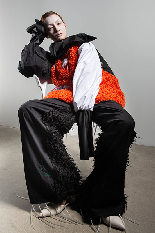 In the collection of <Comedy>, she was inspired by the comedy movies and variety shows, which made her feel bitter. Therefore, she thought about the true meaning of comedy from another angle and tried to explore the aspects that people ignore in life. She researched the clothing of the 1930s. The dresses of the upper-class figures and the materials worn by the lower-class figures are very sophisticated. And the inspiration of the silhouettes is from the actions, performances, and props of the comedy movies.