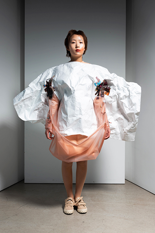 The work <Quirks> tells a story about the eccentricity forms unconsciously in Vicky's life. Based on observations, these quirks include childhood memories and unconscious preferences. Vicky Miao is eager to express herself through clothing, rather than speaking straightforwardly in language to the audiences. She uses variety making skills in this work which come from the story. For example, the idea of processing by the plastic packaging machine comes from the memory of sealing nougat packaging.