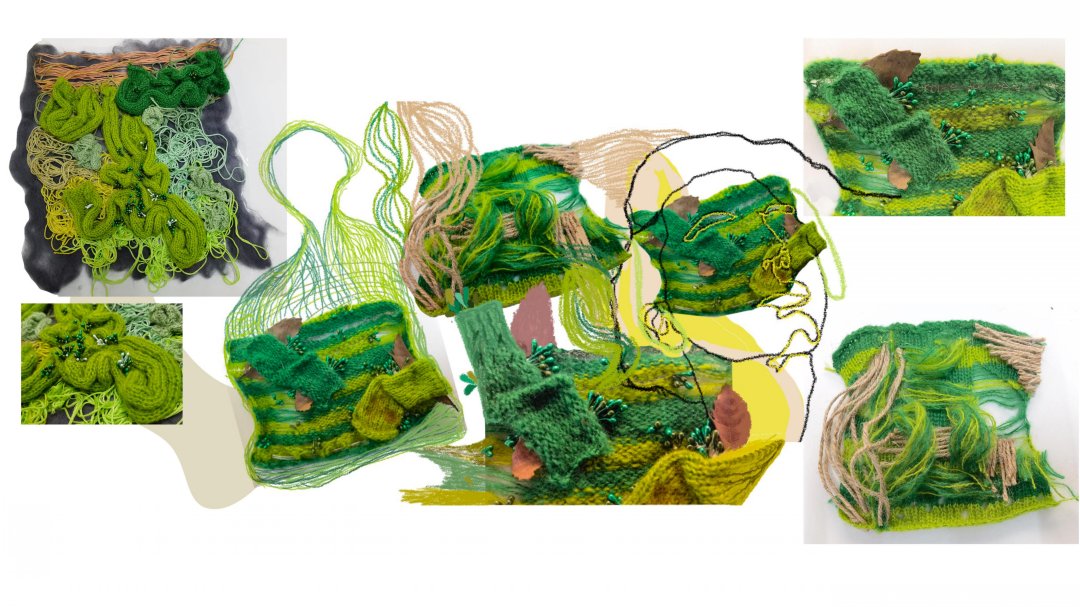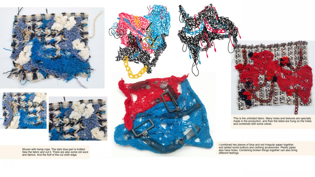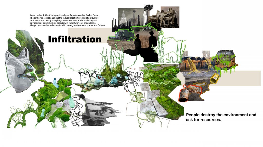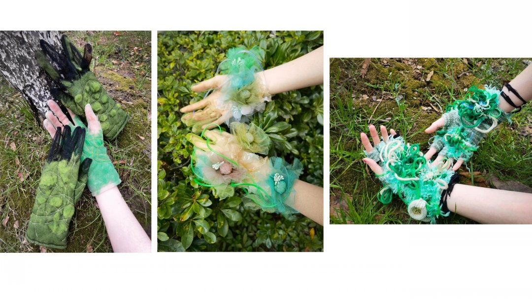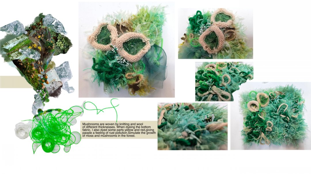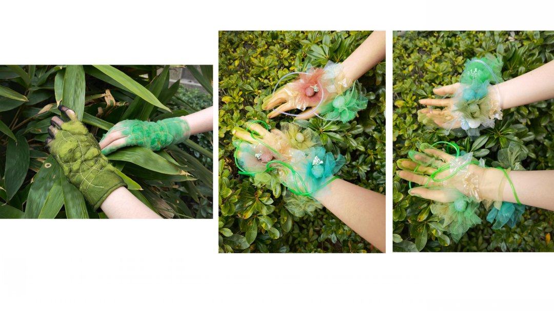 因為家庭的原因,我從小就接觸到了許多面料,因此我對不同的材料的組合產(chǎn)生了濃厚的興趣,環(huán)保和可持續(xù)的概念也是我在創(chuàng)作設計項目時必不可缺的考慮方面。在作品《滲透》中,我以在森林中的塑料污染現(xiàn)象和《寂靜的春天》這本書為靈感進行面料設計。在這個系列的作品中,我嘗試運用多種非常規(guī)材料與傳統(tǒng)面料結合,例如:PVC面料,塑料管,紗,毛線等等,并通過結合多種技術,如針織,滴膠凝固,熱風機融解來體現(xiàn)污染和自然環(huán)境互相滲透的主題。最后我設計出了三副手套,以表達所有的污染都是人類親手造成的這一理念,并在自然中拍攝了最后成品的照片和視頻,以表達手和環(huán)境無言的對話。