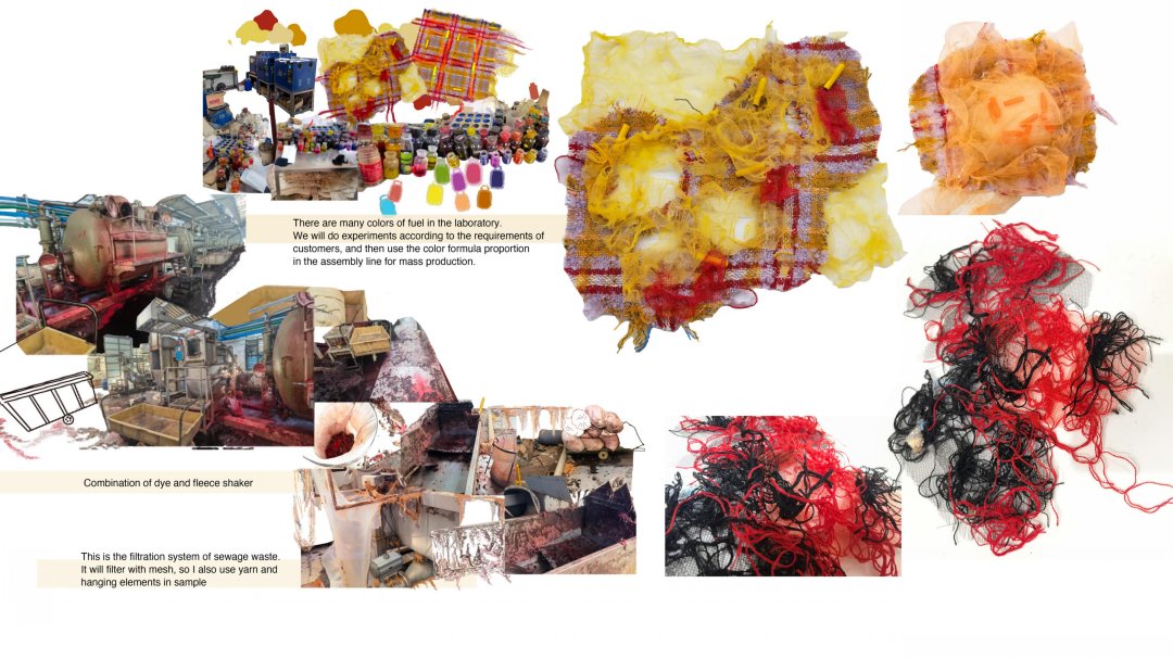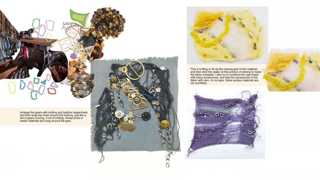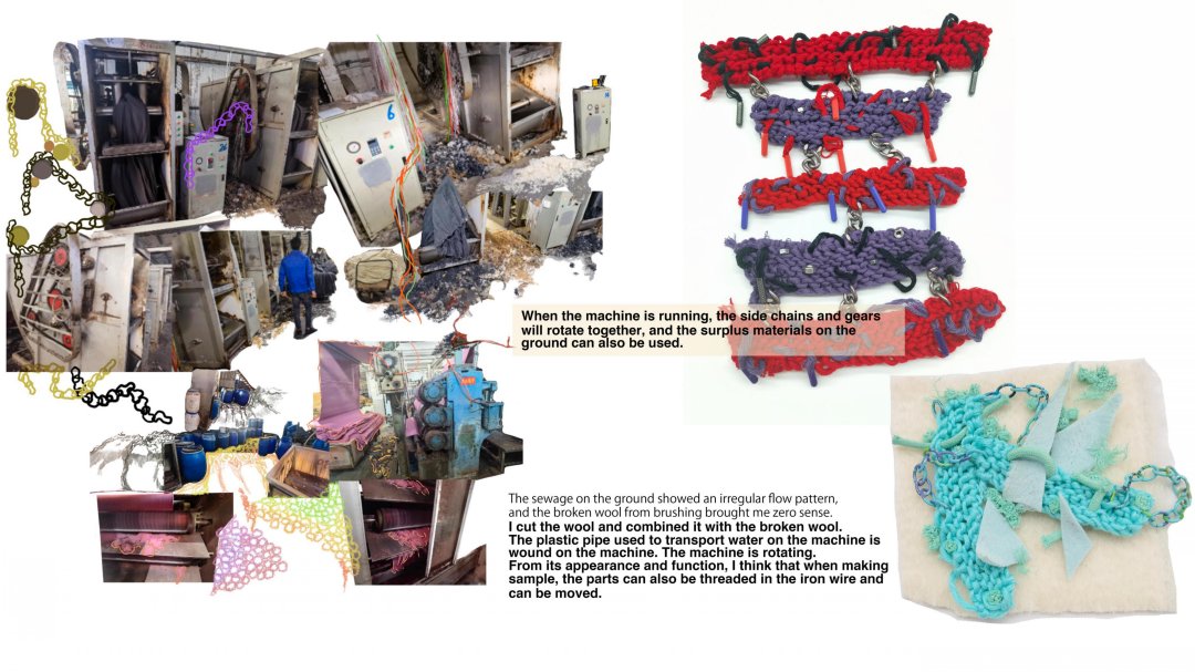 在作品《再生》中,我以在工廠里觀察到的面料浪費現(xiàn)象為靈感,對服裝產(chǎn)業(yè)浪費進行了調(diào)研,利用工廠收集的廢棄面輔料來進行創(chuàng)作。我從在工廠的一手調(diào)研拍攝中提取了面料懸掛、堆積、鎖鏈、機械零件、管道、打包繩、紐扣等元素,結合編織、針織、刺繡等多種工藝進行面料設計,體現(xiàn)出凌亂與規(guī)整間的對比、轉(zhuǎn)換。最后,我把所有面料組合成了一塊大的面料懸掛在了工廠的機器上,我認為這些“不完美”的破損碎片組合起來有種豐富而特別的美感,與灰暗的工廠形成了強烈的對比沖擊。