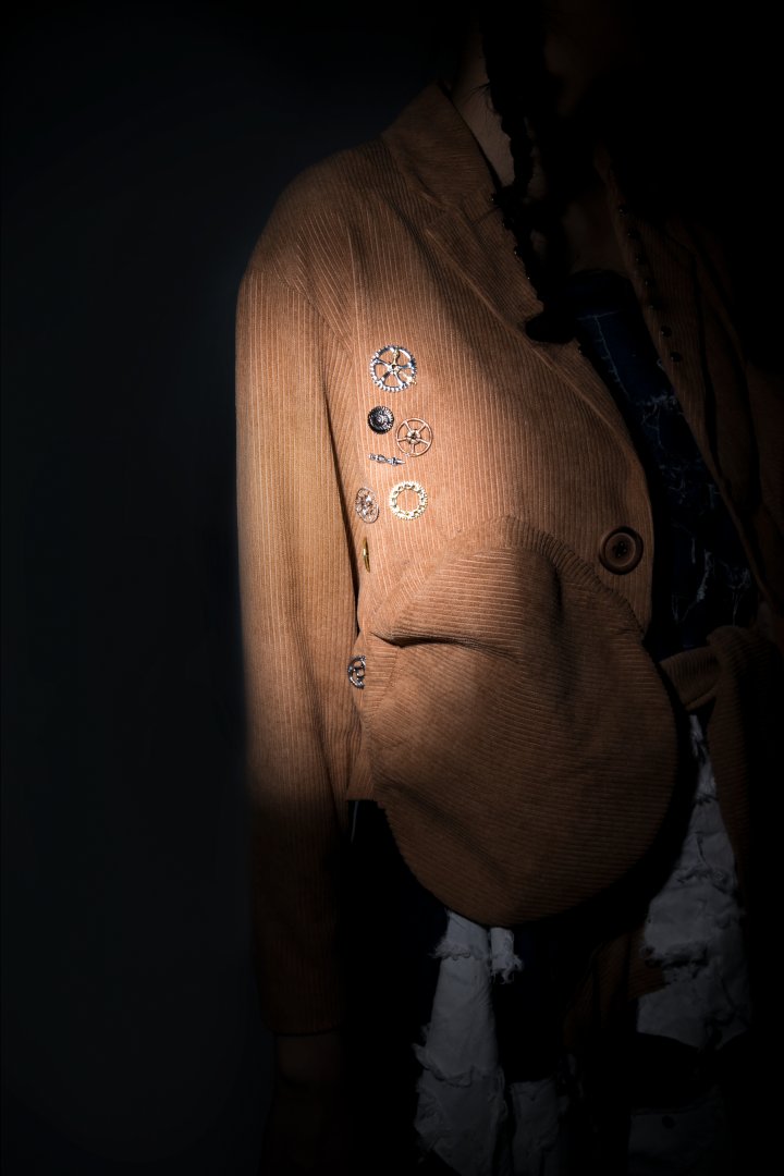 我在設(shè)計(jì)時(shí)注重將設(shè)計(jì)感與服裝的實(shí)穿性結(jié)合,并熱衷于從過去的時(shí)裝中獲得靈感,這一點(diǎn)充分的表現(xiàn)在了我的作品《TIMES》中。這個(gè)系列從黑白電影《摩登時(shí)代》中獲得靈感,該電影以黑色幽默的手法表現(xiàn)了美國(guó)經(jīng)濟(jì)大蕭條下工人階級(jí)苦苦掙扎的生活狀態(tài)。我對(duì)20世紀(jì)30年代美國(guó)人們的穿著服裝進(jìn)行了調(diào)研,提取了當(dāng)時(shí)流行的直筒式風(fēng)格的連衣裙,以及電影中資本家干凈整潔的西裝、工人階級(jí)破舊不堪滿是油污的背帶褲和牛仔工作服,并結(jié)合電影中大量出現(xiàn)的螺絲,紐扣,齒輪等元素進(jìn)行面料改造。通過火焰噴槍將齒輪,螺絲和紐扣進(jìn)行燃燒,整體呈現(xiàn)出一種復(fù)古而不乏現(xiàn)代休閑感的風(fēng)格。