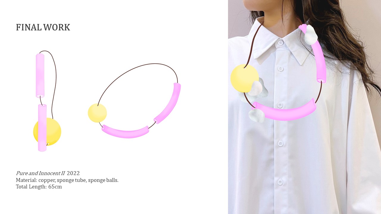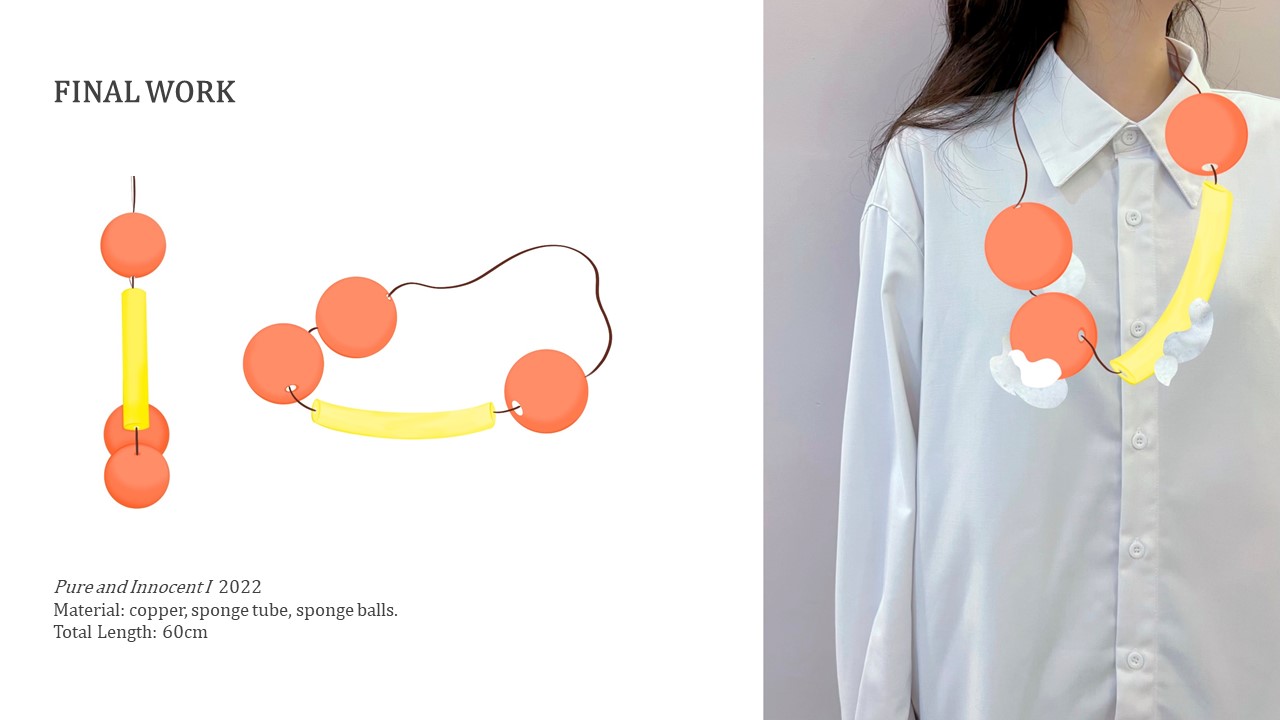 我喜歡觀察日常生活中的小事,并且每當(dāng)我看到、聽到、觸摸到一件物品我都會思考它們所具有的更廣闊的意義。在我看來,首飾似乎充滿了一種神秘的能量能夠傳遞我的感受,維系我與他人之間的情感。我試圖用一些有趣的材料和現(xiàn)成物制作首飾,以展現(xiàn)日常生活奇妙的一面。 正如我的作品《純粹與天真》,清潔海綿對我來說不僅僅只是清潔的工具。他讓我想起兒時邊洗碗邊玩泡泡的情景,象征著童年的天真快樂。所以在這件作品中我把重點(diǎn)放在身體與海綿以及泡沫的互動上,以再造和重現(xiàn)童年稚氣的心境,也希望佩戴者能夠感受到平凡物品的美。